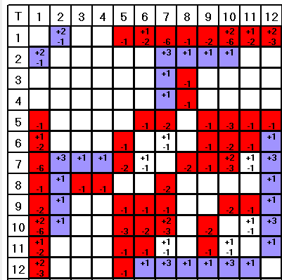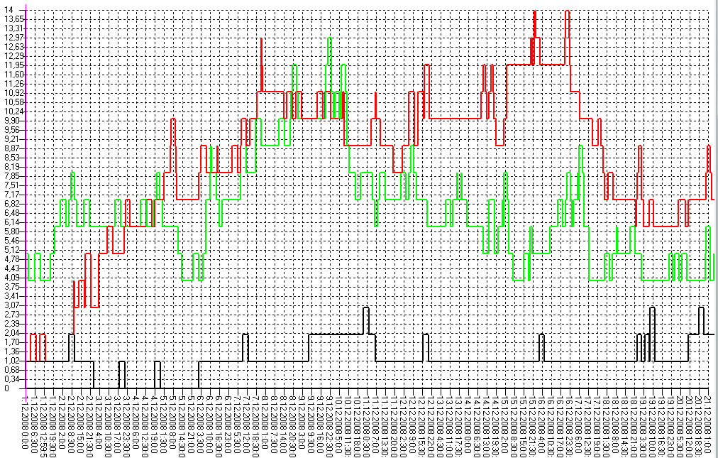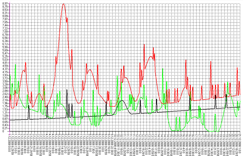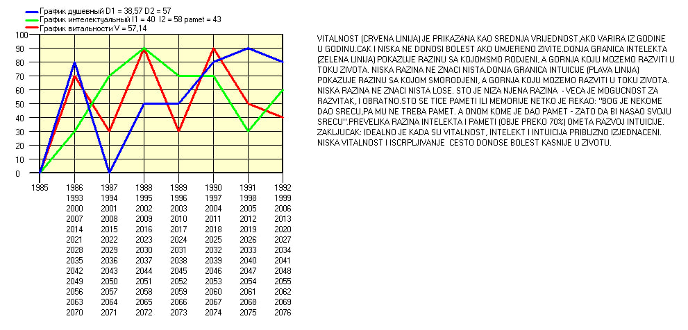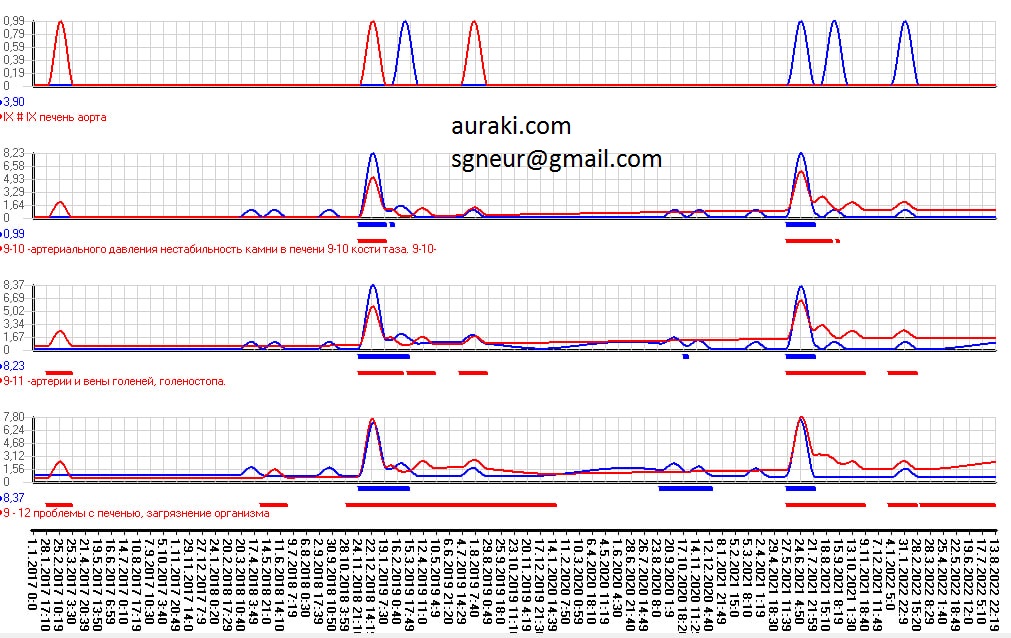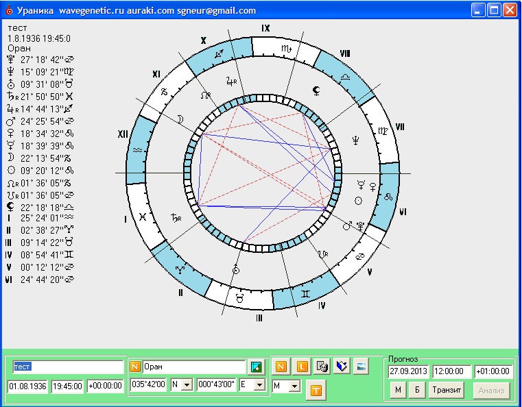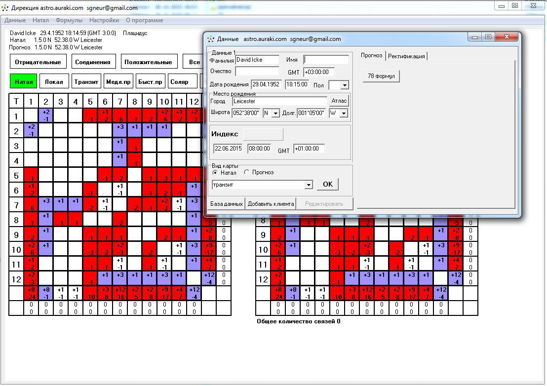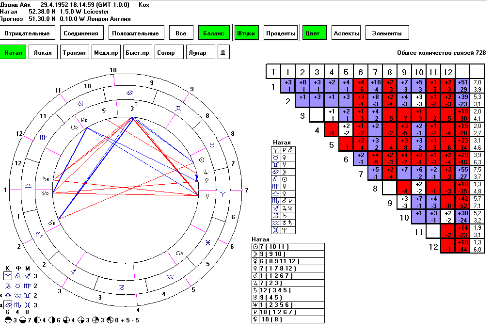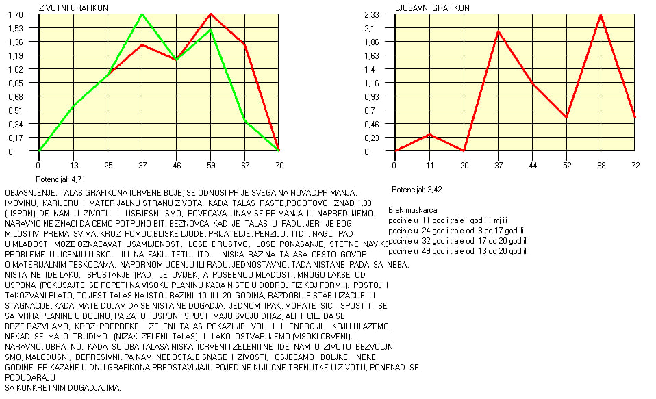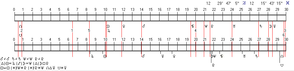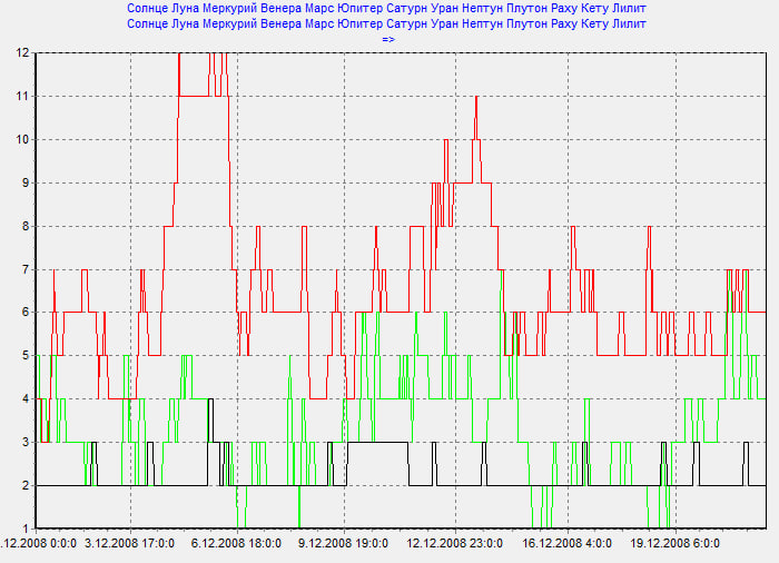 If there are no three progressed indications, the graph is red. If there are three progressed indications, the graph is blue, indicating the event will be realized! The peaks indicate the exact aspects. The scores indicate the strength of the situation (on the left side of the graph). The higher the score, the more exact aspects are present in the formula.