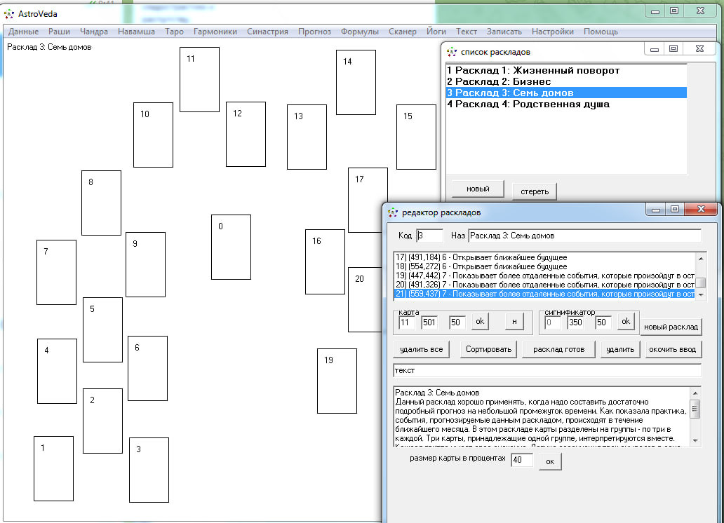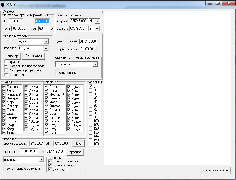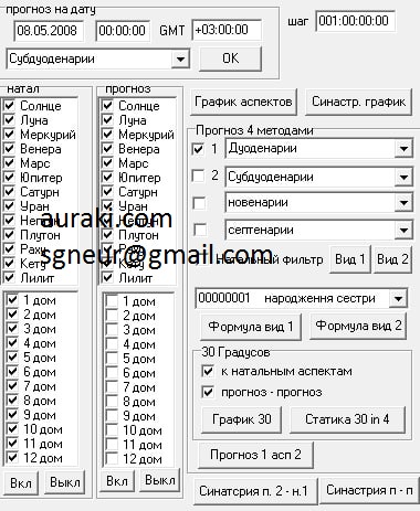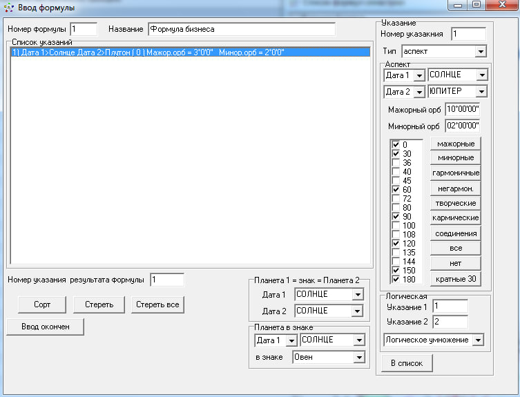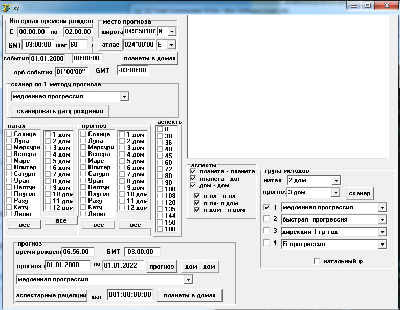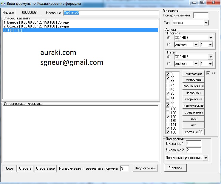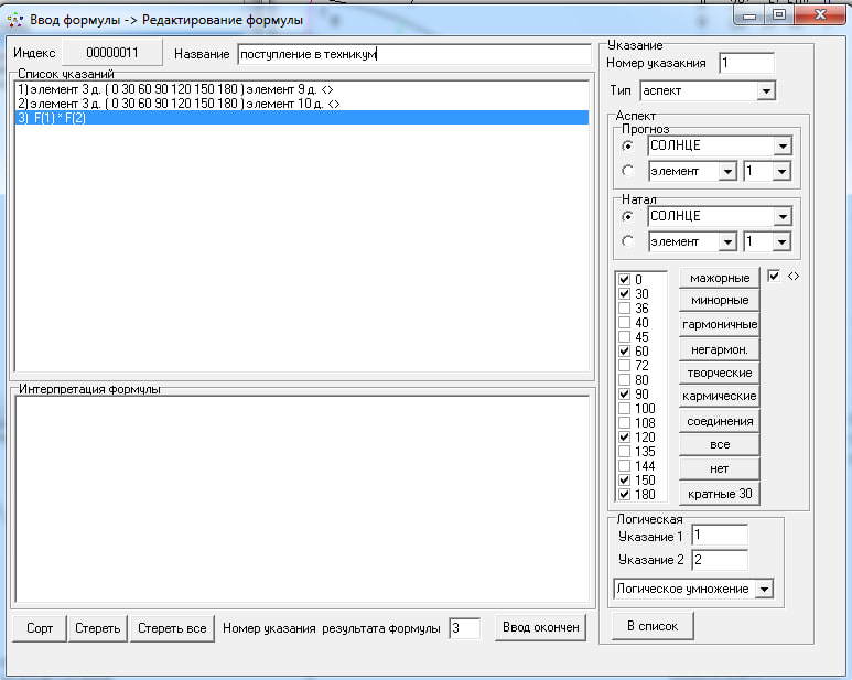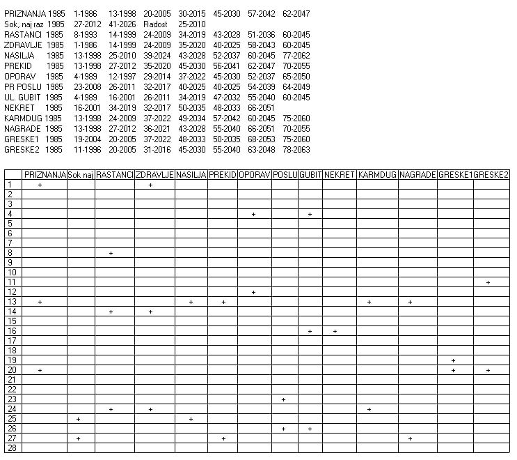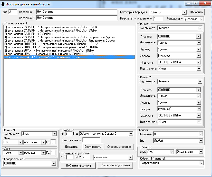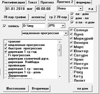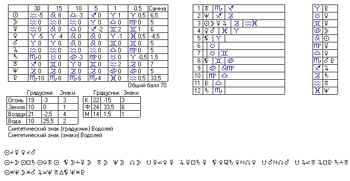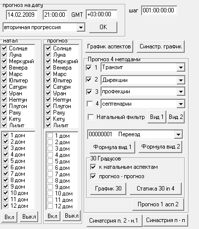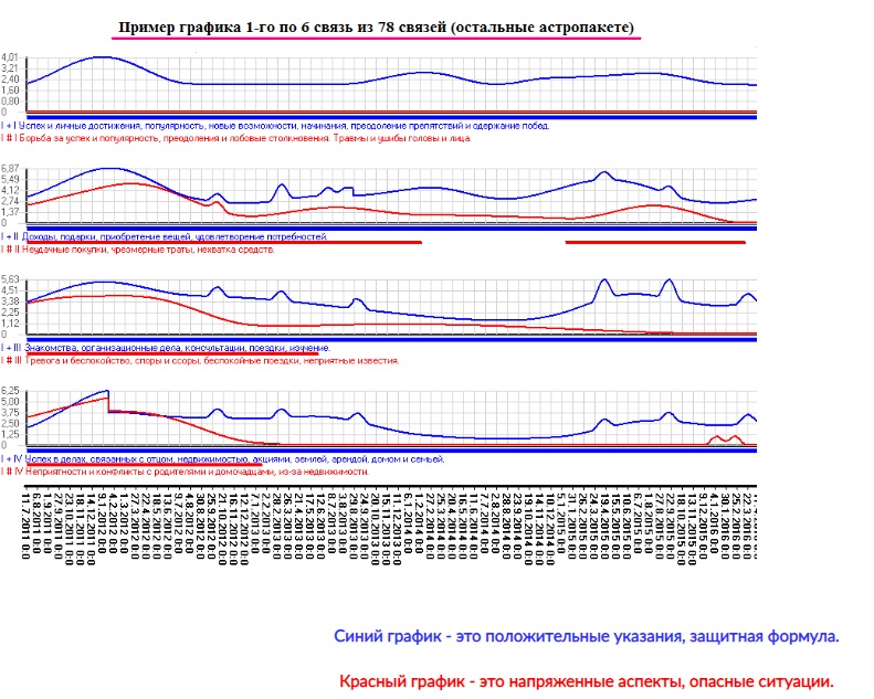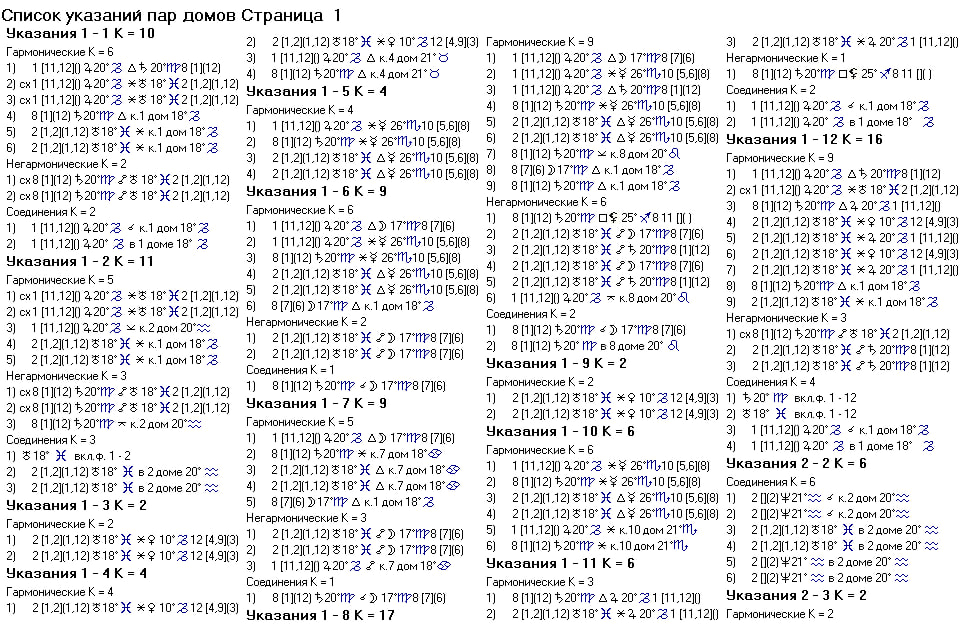 The forecast includes 156 charts (78+78) of simple formulas. The event formulas consist of pairs of houses that can have harmonious and tense interactions. The superposition of the harmonious and tense charts shows which interaction predominates in a person's life.