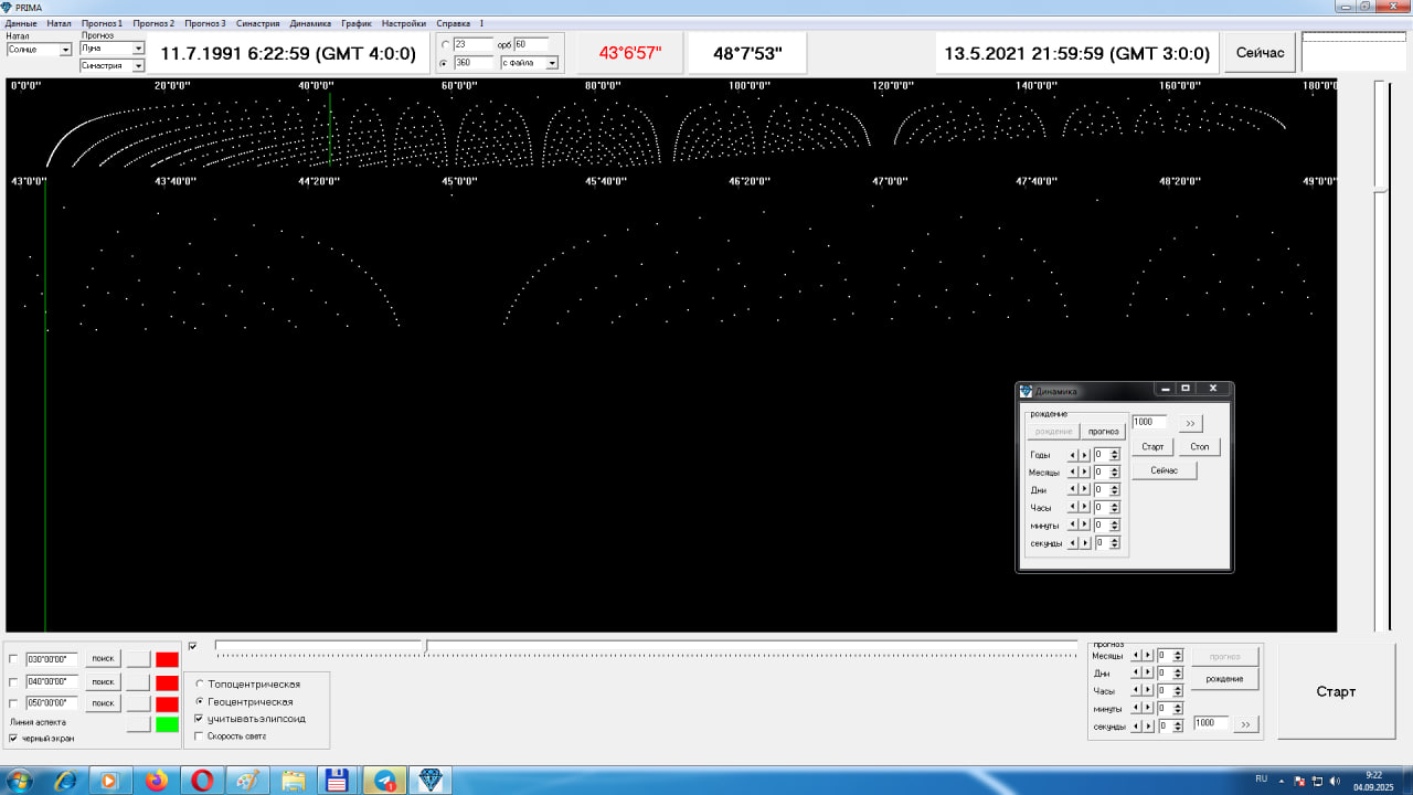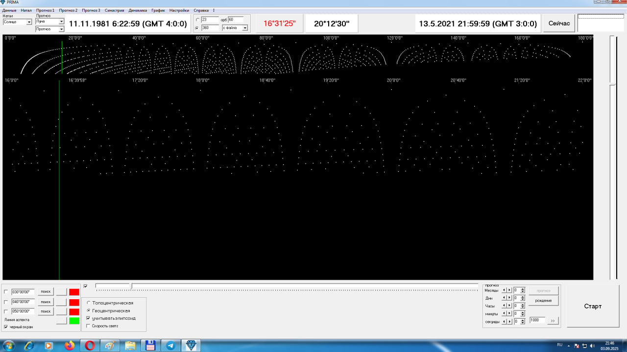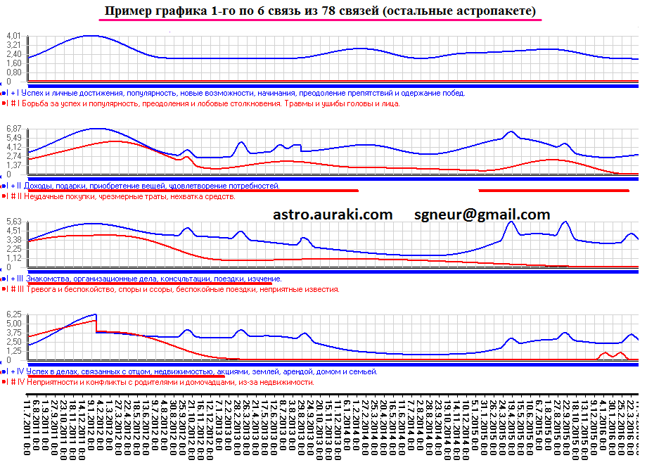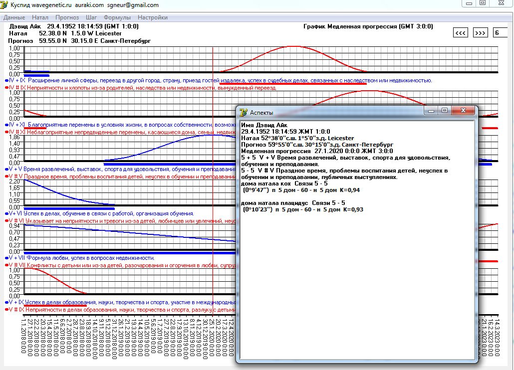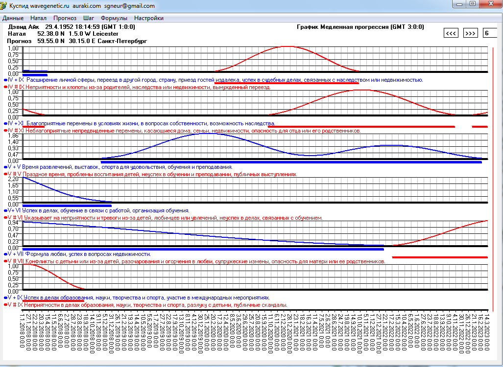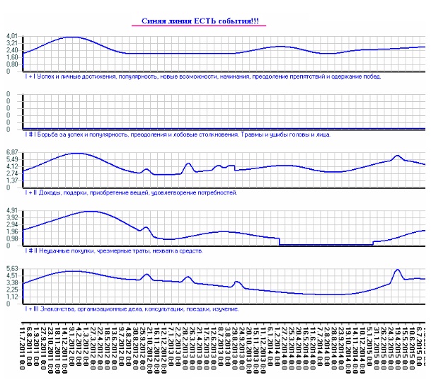 Progressions have background aspects. The presence of background aspects indicates the readiness of an event. The impetus for an event is the precise aspect. The blue graph shows the presence of three aspects in slow progression. Peaks on the graph indicate the precise aspects that trigger events. If a blue peak is visible on the graph, it means the event will occur within a few months of the forecast date.