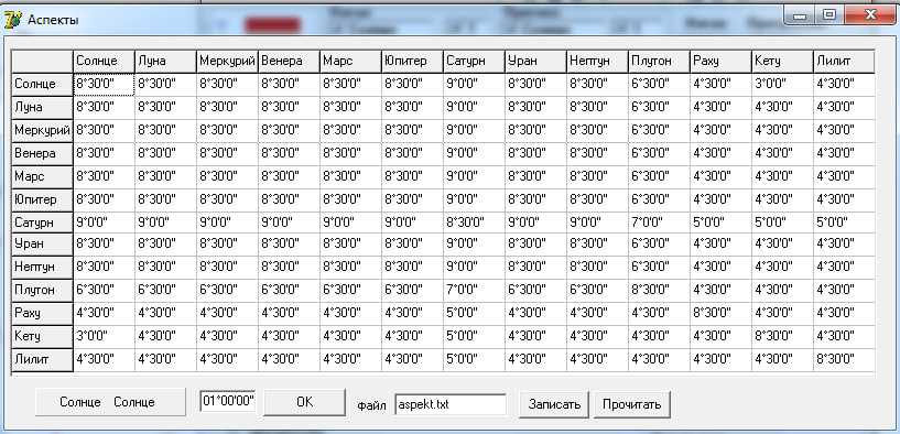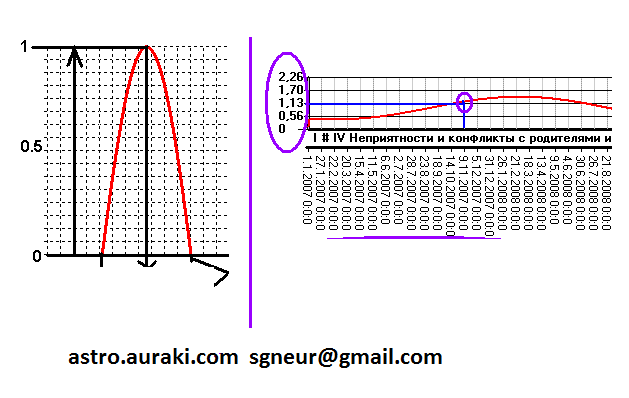 коэффициент = 1. При максимальном орбе аспект приближается к нулю. График КТА 1 аспекта выглядит на картинке так: