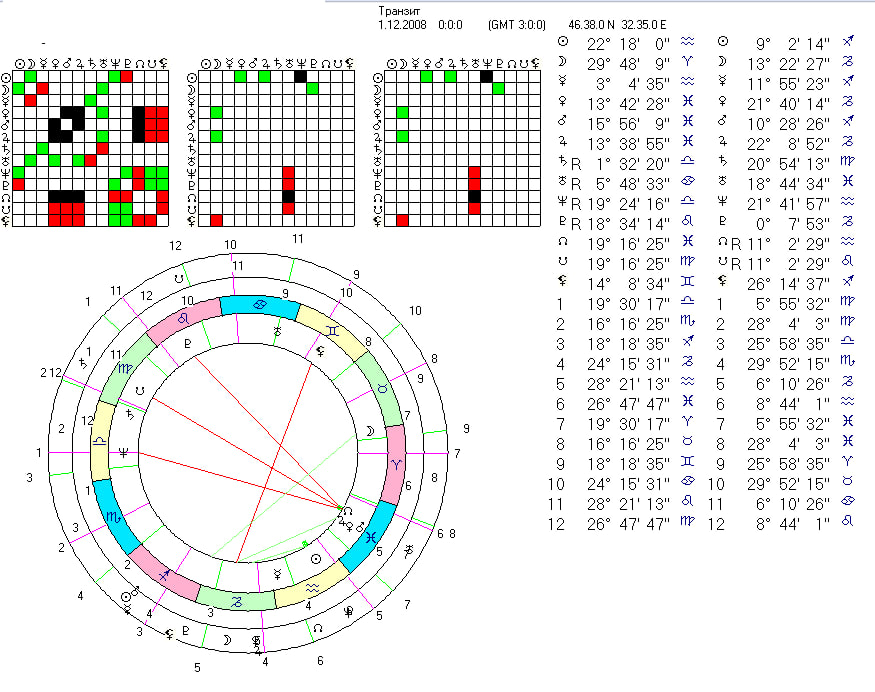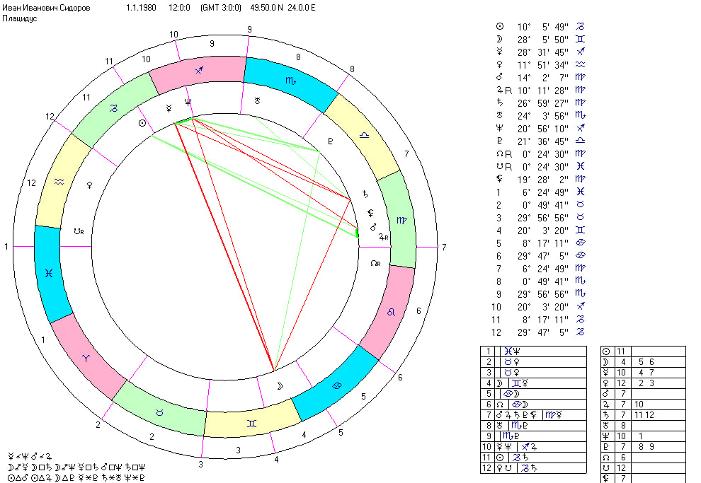 Иначе обстоит дело с прогрессиями. Они не меняют своего значения ни при каких обстоятельствах. Напряженные прогрессивные аспекты, такие как: квадратура, квиконс, оппозиция — определяют негативные события, а гармоничные: полусекстиль, секстиль, трин — сопутствуют успеху и удаче. Соединение, как известно, зависит от взаимодействующих элементов конкретного гороскопа.