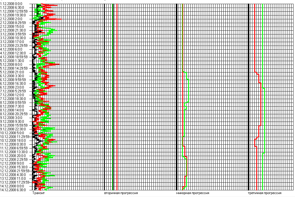 компьютера и назвать его программой нашей судьбы. Отсюда становится понятным, что все виды прогрессий технически отличаются друг от друга скоростью и особенностями движения элементов нашего внутреннего пространства. При этом, как и в случае транзитов, направление прогрессий может быть прямым, направленным в будущее, и обратным — волна, идущая в прошлое от момента
