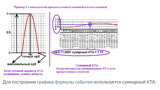 Чем точнее аспект в прогрессиях, тем больше вероятность события При построении графиков используется качественный параметр КТА - коэфициент точного аспекта. КТА раcчитывается на основе графика в виде колокола При точном орбе